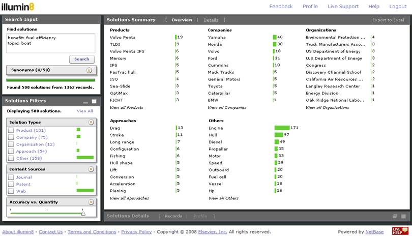 Here is a screen shot of what an end-user might see using this service. In this example, the user is interested in solving the problem of fuel efficiency in boats. He or she wants to see what products and approaches are out on the market to address this problem and what companies are providing these solutions. The user enters the topic (boats) and the benefit (fuel efficiency) in the search box and gets back information that is organized in a logical way. In this example, you can see that query returns information about products that address the problem as well as the companies that make the products, organizations that deal with energy, as well approaches to solving the problem (drag, stroke, etc). These are ranked. Users can then drill down on any of these areas to get snippets (and full text) associated with areas that he/she is interested in analyzing.
