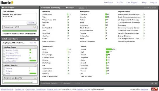 An interesting example of this is illumin8, which is being offered by Elsevier, in partnership with Netbase. The service is targeted at R&D knowledge workers looking to solve technical and business problems. According to Elsevier, knowledge workers spend more time per week trying to discover relevant content relating to a particular problem area than analyzing that information (5.5 hours/week accessing vs. 4.7 hours/week analyzing). These workers are usually using a google-like search engine. I think everyone can agree that the google-like search engine is not ideal for research purposes, so I won’t belabor the point here. In the case of the R&D knowledge worker, often one goal is to gather information relating to a particular problem, finding products that solve that problem, as well as understanding the approach used to solve the problem.