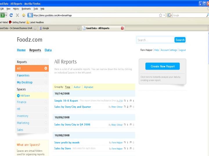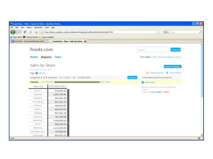 The user starts a project and invites others to join. These people can generate reports that others can see (for example, I created some reports and Peter Olmer created some other reports). The reports are arranged by date and who created them. They can also be filed into one of the spaces on the left. If we look at the Sales by Store report we would see the following: