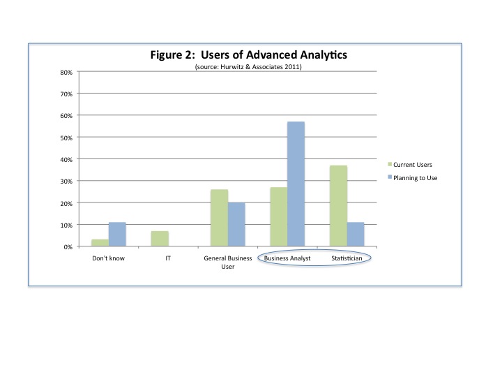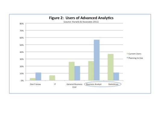 • Figure 2 illustrates that users of advanced analytics in many organizations have expanded from statisticians and other highly technical staff to include business analysts and other business users. Many vendors anticipated this shift to business users and enhanced their offerings by adding new user interfaces, for example, which suggest or dictate what model should be used, given a certain set of data.