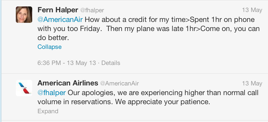 My point is that if you’re going to engage your customers online via the channel that they used in the first place, make it count. This exchange simply annoyed me. Maybe twitter wasn’t the best channel for customer service, but it is the one that I used since no one was answering the phone and the American site couldn’t let me perform the function I wanted to do. I’m not saying its’ easy to engage adequately via twitter. To do this properly would have involved more finely tuned text analytics to understand what I was actually talking about as well as a way to integrate all of my data together to understand me as a customer (i.e. my loyalty information, recent trips, etc). Maybe the customer service reps were tired after last month’s outage debacle at American when thousands of passengers were